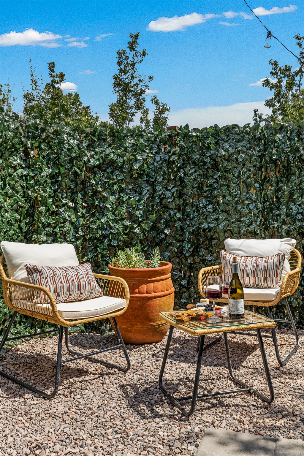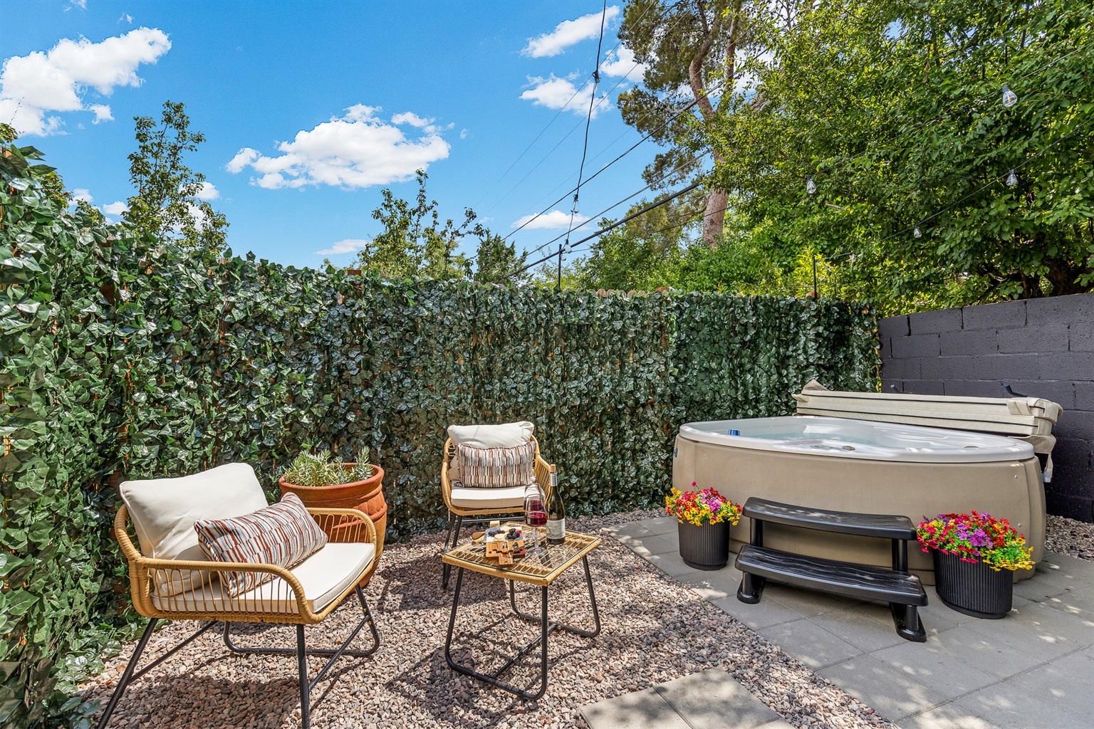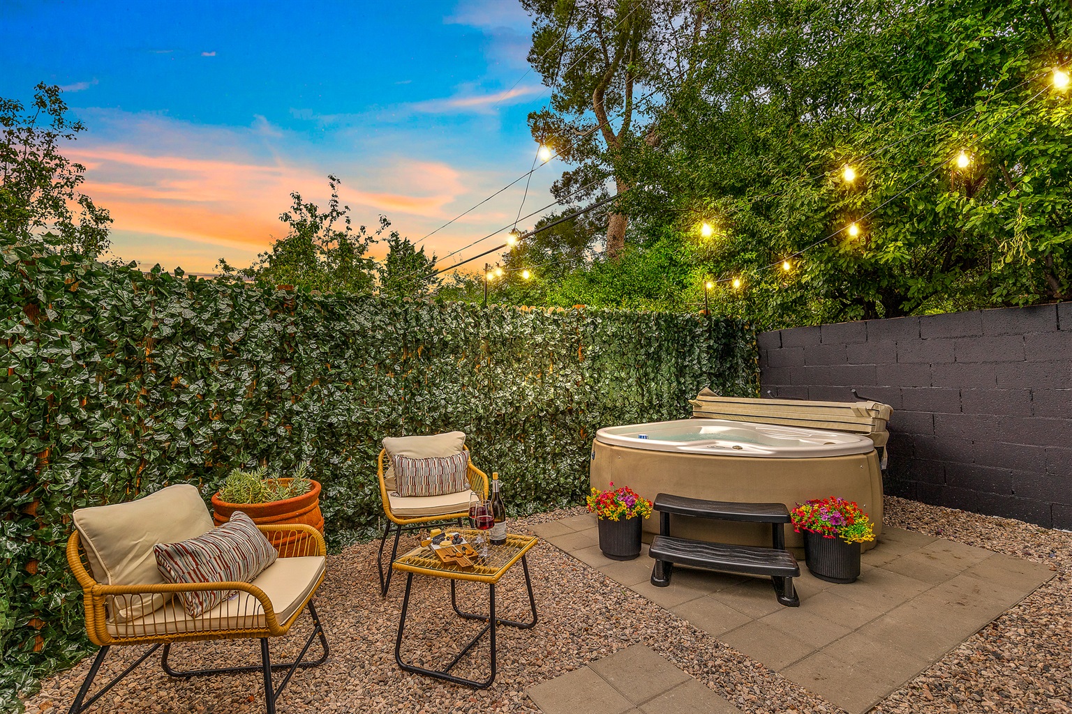 - Backyard: 2-person hot tub, string lights, lounge chairs, Airport Mesa backdrop