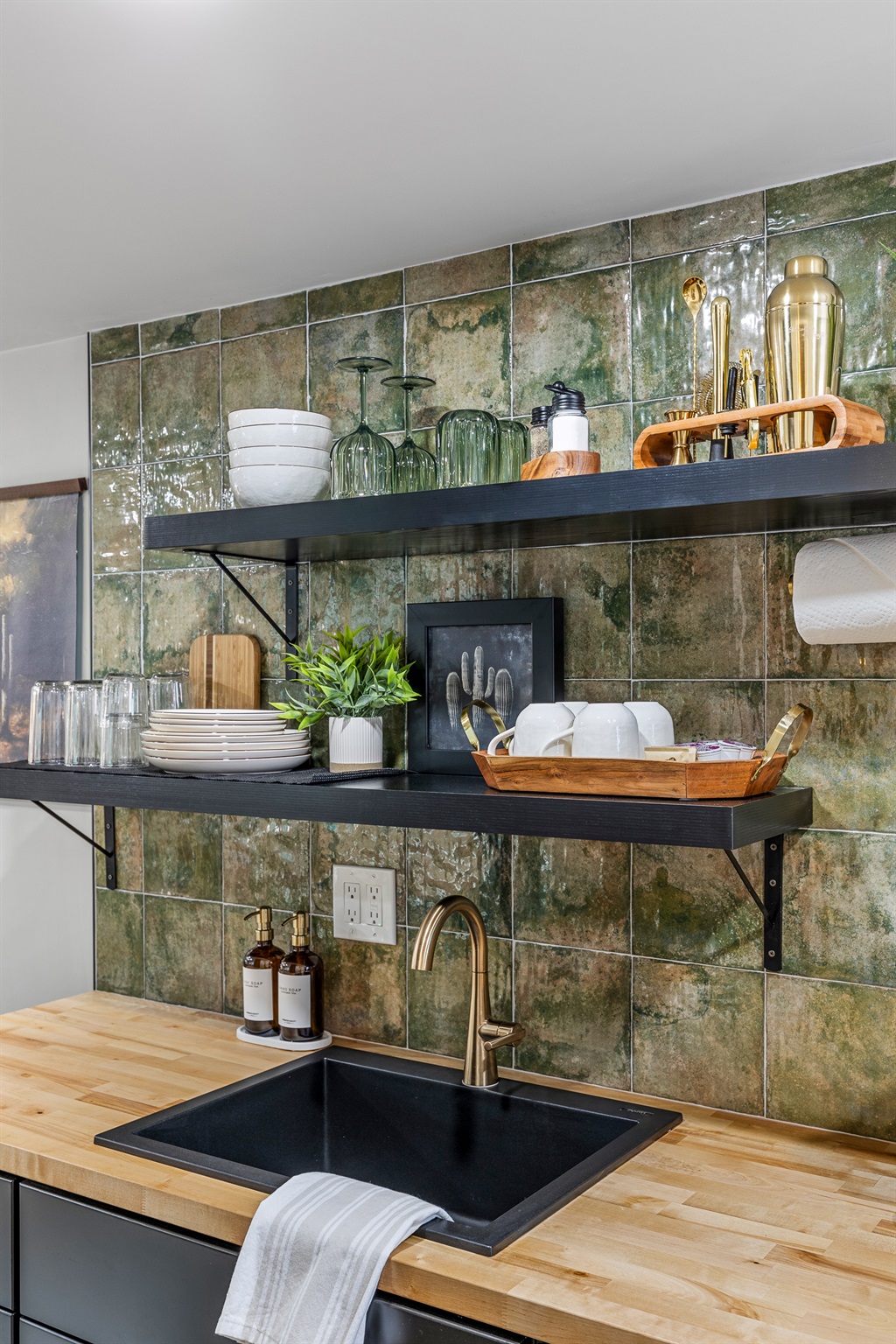 - Kitchenette with Keurig, toaster oven, hot plate, blender, kettle, and mini fridge